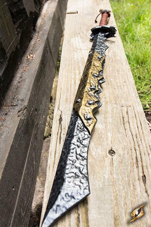 Dette 110 cm lange sværd har en 80 cm klinge skulptureret og håndmalet til at virke smedet af forskellige metaller efter at have set adskillige slag.