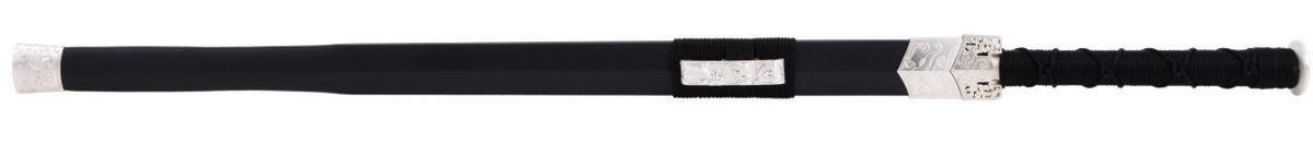 Sværd med sort skede, dekorative hvide metaldele og sort blad med guldmønster.