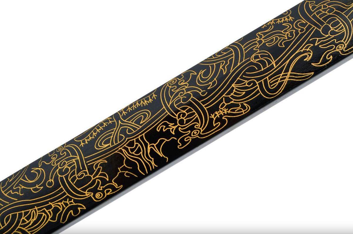 - Skede og Mønster: Sværdet leveres med en sort lakeret skede, smukt indgraveret med et gyldent mønster, der tilføjer en luksuriøs touch. Mønsteret fremhæver enestående skønhed og elegance.