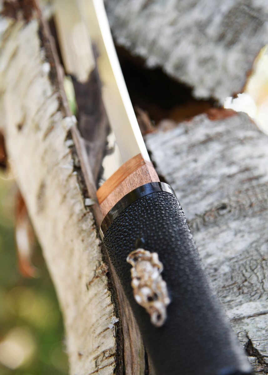 - Håndforarbejdet T10 stål: Bladet er smedet af et af de stærkeste stållegeringer, hvilket sikrer langvarig holdbarhed og skæreeffektivitet.