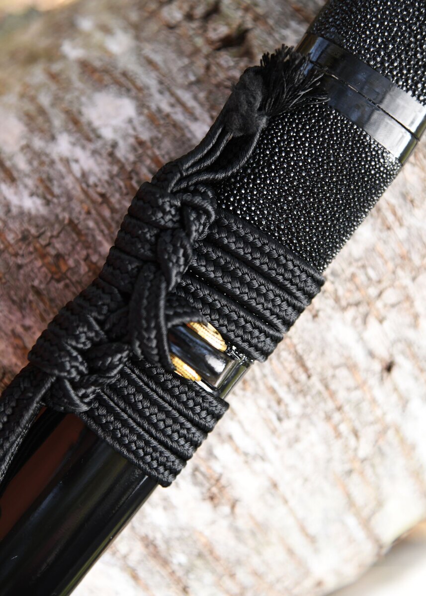 Den håndlavede saya (skede) er lige så imponerende, med et sortlakeret finish over Samegawa rokkeskind, hvilket giver en raffineret og stilfuld fremtoning. De unikt formede kojiri, kurikata og koiguchi er lavet af ægte bøffelhorn og afslutter sværdets udseende på en autentisk måde. Det hele bindes sammen af en premium silke sageo, der sikrer funktionalitet og æstetik.