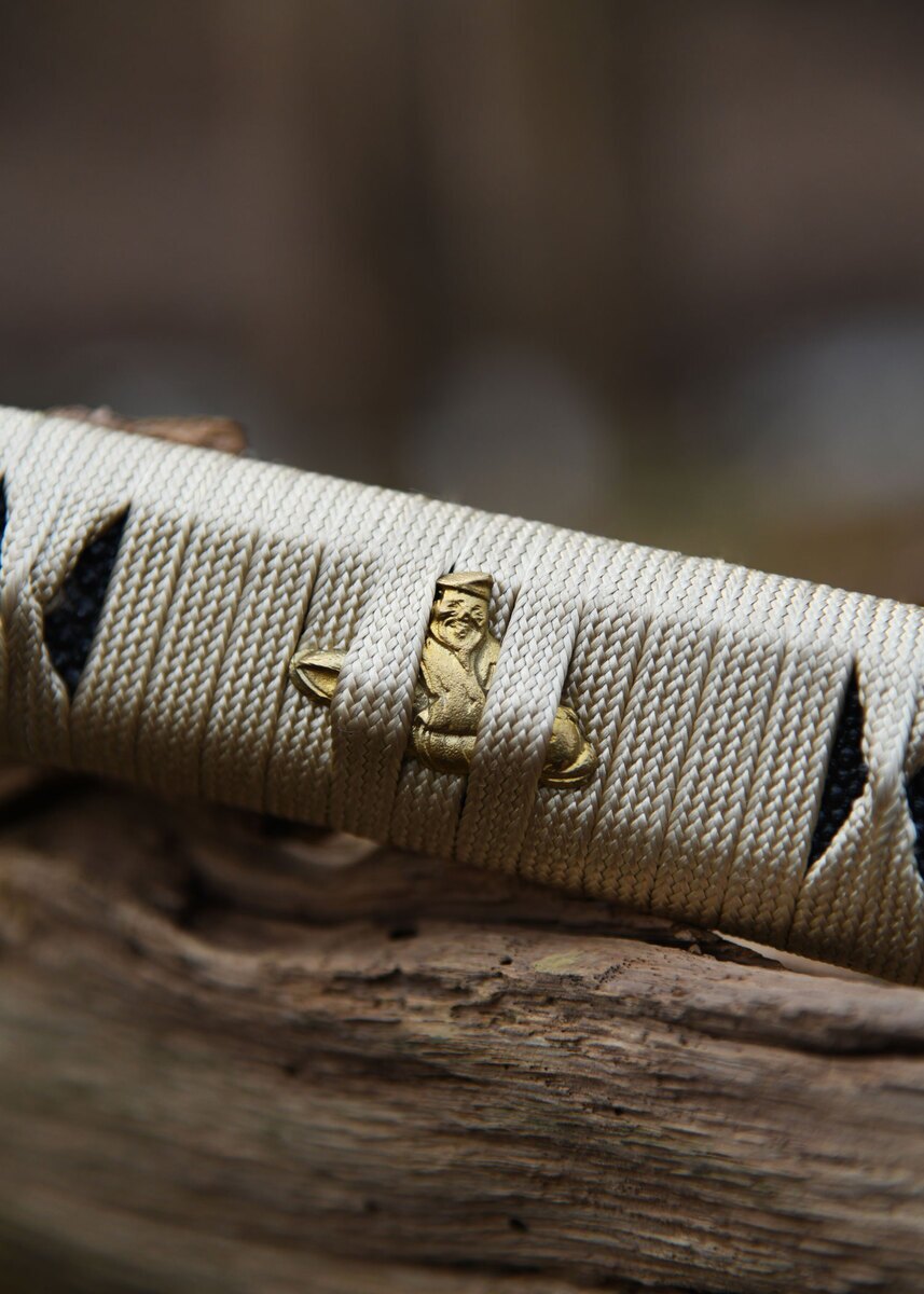 Tsukaen (håndtaget) er omviklet med sort rokkeskind (Samegawa) og traditionelt indpakket i gylden silke ito i Katatemaki-stil. Detaljer som de guldplaterede menukis og sortjern tsuba, kashira og fuchi fremhæver den rige æstetik, der kendetegner denne wakizashi. Hver del af designet er nøje udvalgt for at skabe en harmonisk balance mellem elegance og funktionalitet.