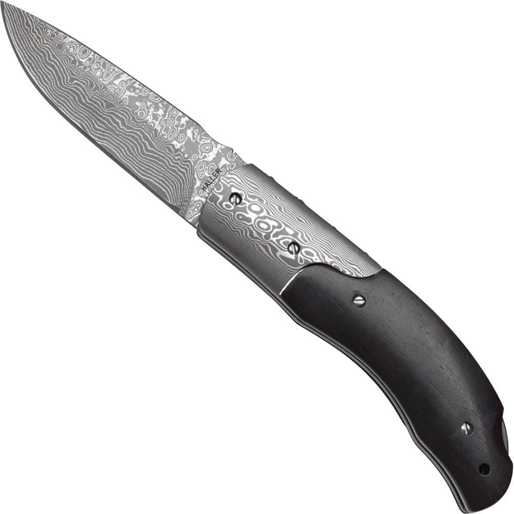 Damaskus Foldekniv, Ibenholt Træ Skæfte - Elegant lommekniv med klinge og bolsters i damaskusstål (71 lag). Håndtag af ibenholt træ, neglerille til nem åbning. Bladlængde: 70 mm, vægt: 120 g. Leveres i en eksklusiv trææske.