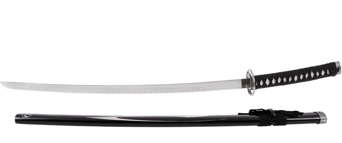 Denne Iaito med en uslibet klinge har et storslået håndtag med sort fletning, en fint bearbejdet stålbeskyttelse og en kappe (Saya) i sortlakeret træ.