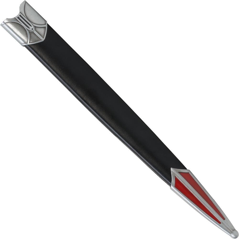 Håndtaget har sorte fløjlsindlæg, skeden er beklædt med syntetisk læder og klingen er lavet af 420 rustfrit stål.