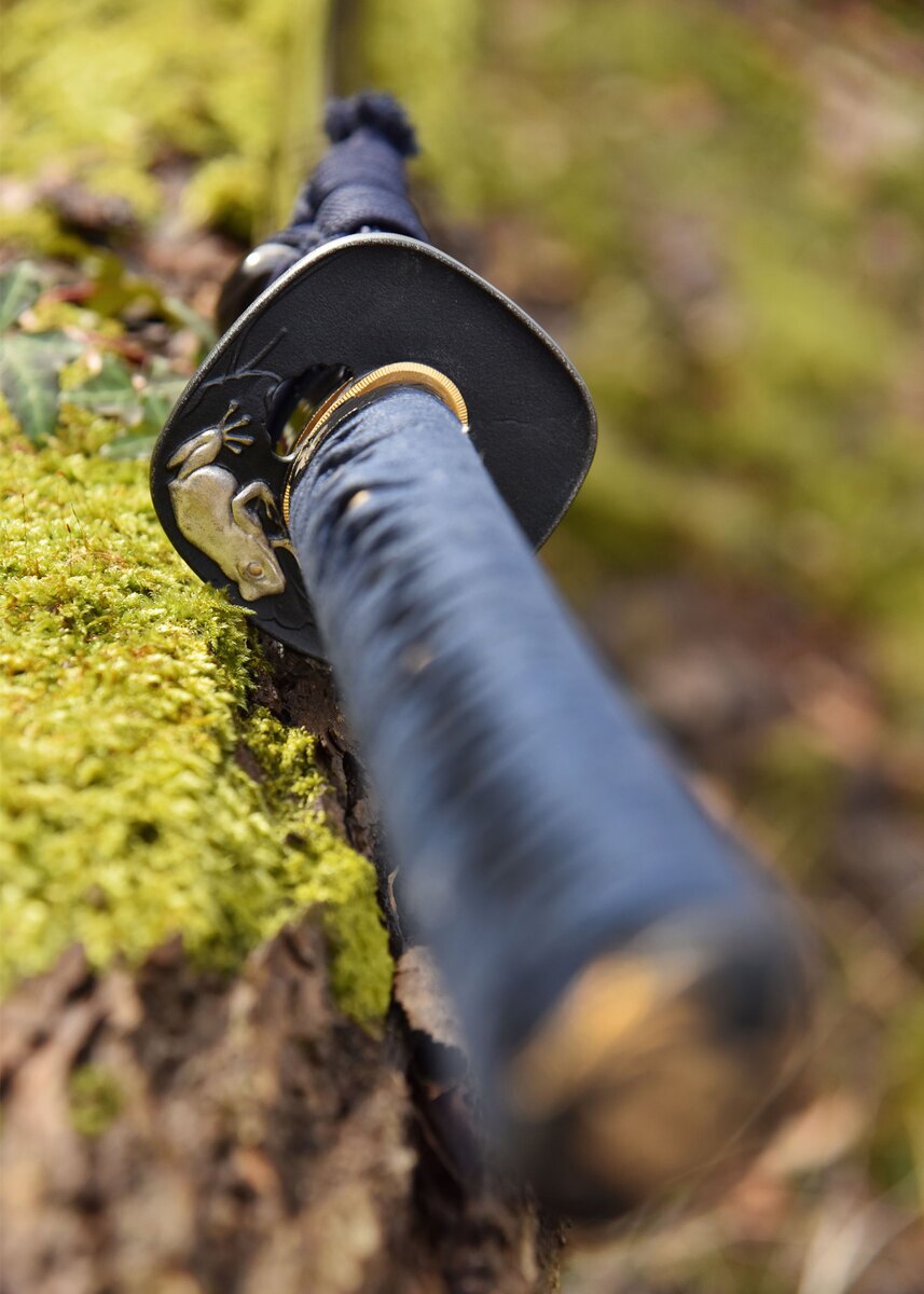 Sværdets tsuka (håndtag) er beklædt med høj kvalitet same (rokkehud) og omviklet med førsteklasses mørkeblå japansk bomuld, der sikrer et sikkert og komfortabelt greb. Sværdets tsuba (sværdbeskytter) er udsmykket med et delikat frø-motiv på en åkande, lavet i sort jern med detaljer i guld og sølv, hvilket tilføjer et unikt og symbolsk element til sværdet.