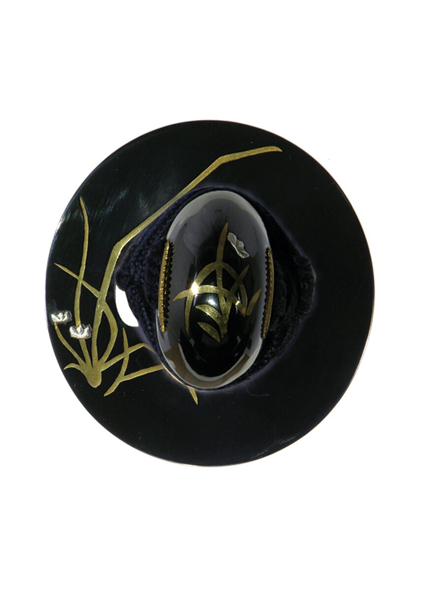 Sværdets tsuka (håndtag) er beklædt med ægte rokkehud (same), og den vævede tsuka-ito og sageo er lavet af premium japansk bomuld, hvilket sikrer et sikkert og komfortabelt greb. Den sorte tsuba er udsmykket med et elegant orkidé- og sommerfuglemotiv, indlagt i sølv, messing og kobber, hvilket skaber et sofistikeret og symbolsk udtryk.