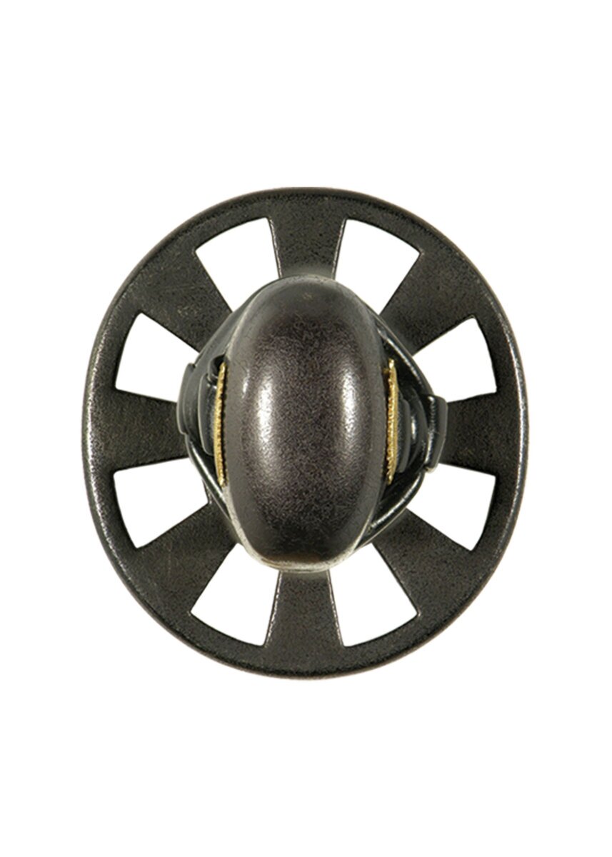 Med en tsuka omviklet i syntetisk sort læder, giver sværdet et solidt og komfortabelt greb, mens den dobbelte fastgørelse sikrer øget sikkerhed under brug. Sværdets sorte, dybt lakerede saya (skede) og sorte bomulds sageo tilføjer et elegant og minimalistisk udseende. Den runde kuruma tsuba er prydet med symbolet for "Dharmas hjul", der repræsenterer den buddhistiske lære om Den Ædle Ottefoldige Vej, hvilket giver katanaen en spirituel dimension.