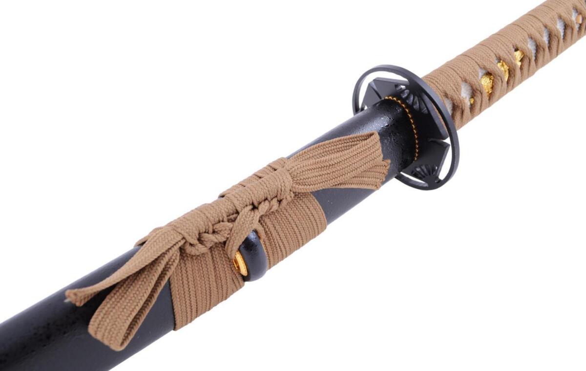 Denne katana har et slebet blad, med et brunt flettet håndtag og en smuk skede (Saya) i tekstureret sortlakeret træ.