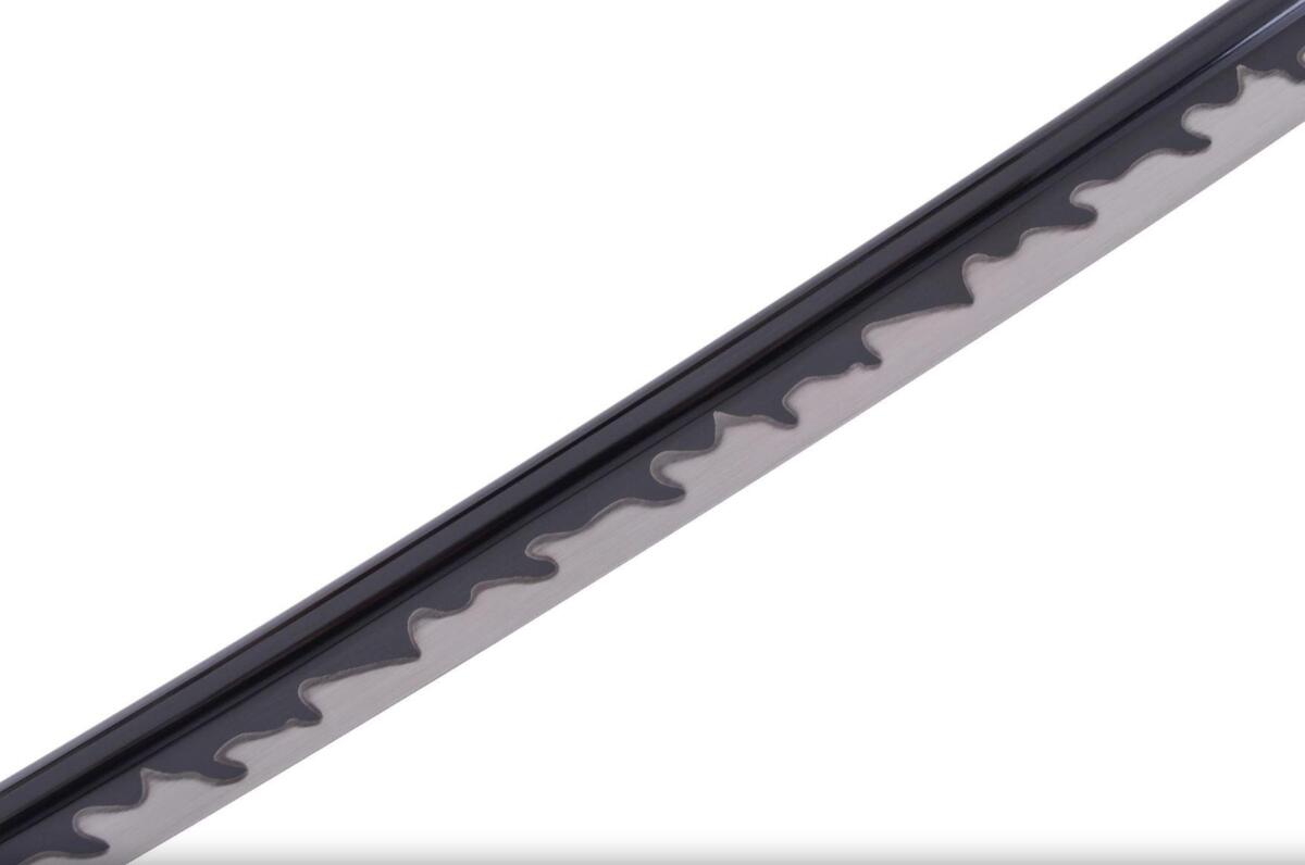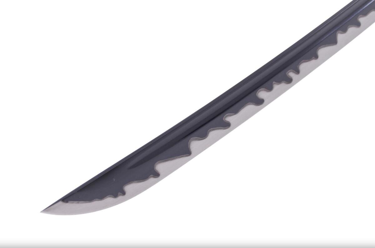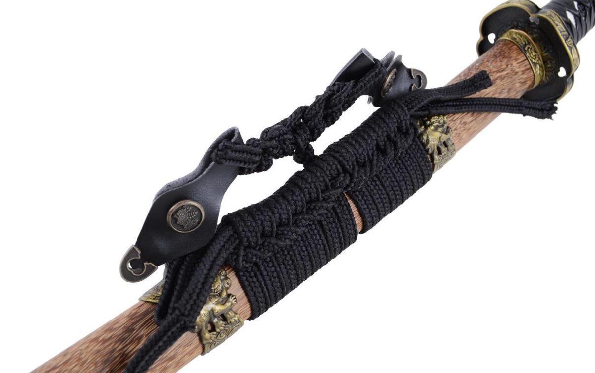Design og detaljer: Denne Tachi har en sort, skærpet klinge med Fuller og Hamon, ideel til skæretræning. Håndtaget (Tsuka) er flettet i sort og hvidt med indlagt rokkeskind og en sort Komainu, som symboliserer beskyttelse. Parerstangen (Tsuba) er udsmykket med blomsterdekorationer og kløverbladsdesign. Saya'en er lavet af naturligt træ, dekoreret med bronze Komainus på enderne af den sorte flettede Sageo, hvilket tilføjer en æstetisk dimension til våbnet.