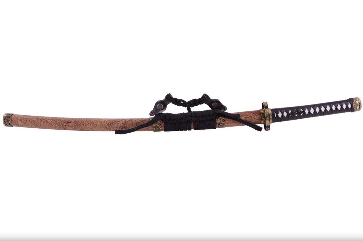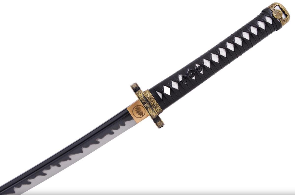 - Håndtag: Sort og hvid flettet Tsuka med rokkeskind og sort Komainu indeni