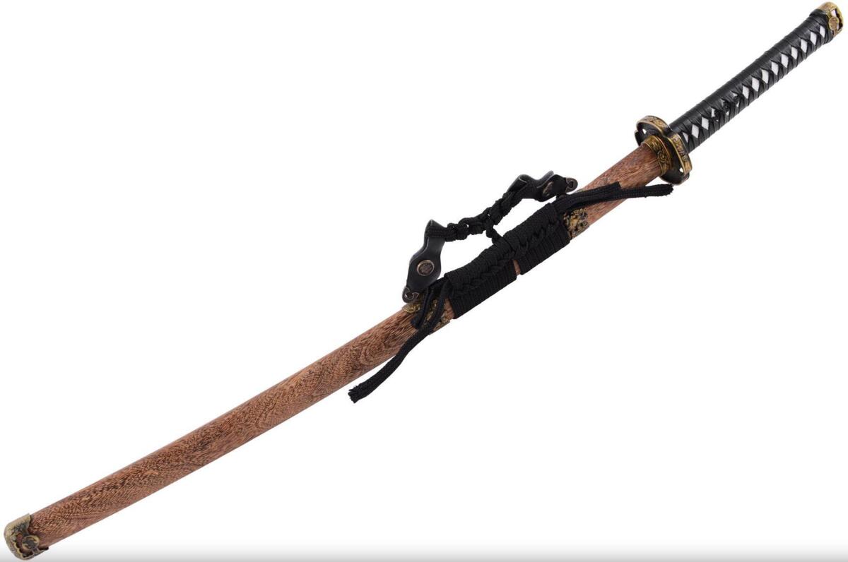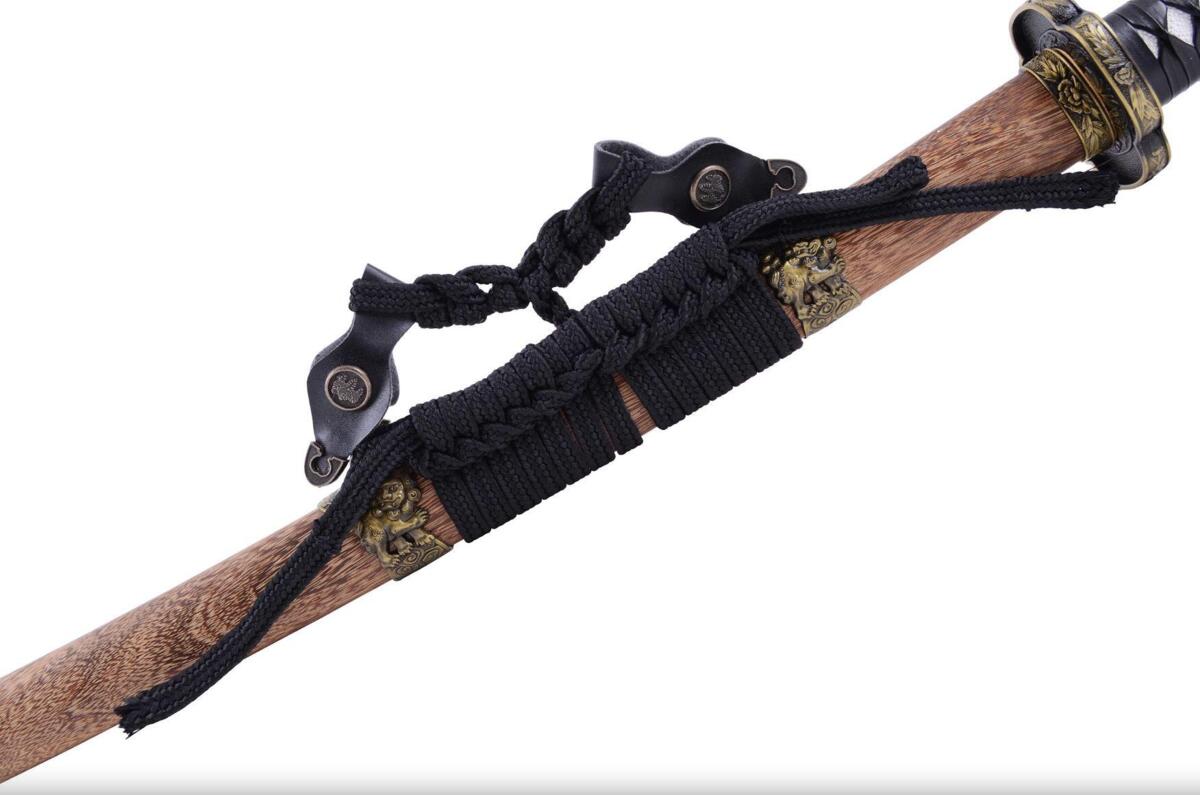 Shen Long, Katana Tachi Bushido, Hideyoshi er et håndlavet tachi-sværd i højmangan rustfrit stål. Med en sort skærpet klinge på 73 cm, sort og hvid flettet håndtag og en naturlig træskede dekoreret med bronze Komainus, kombinerer denne katana traditionelt japansk håndværk med moderne design. Total længde uden Saya: 100,5 cm.