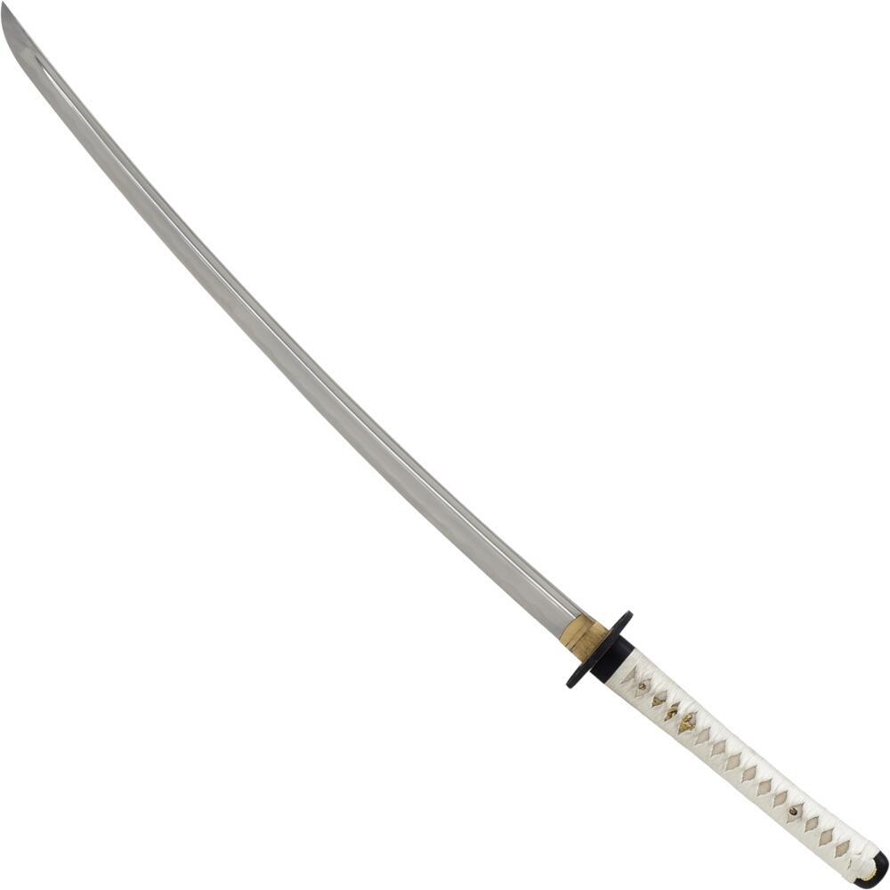 John Lee Shiro Katana - en håndsmedet katana i Shinogi Zukuri-stil med 1045 kulstofstålblad. Skæfte med hvid bomuldsvikling og højpoleret hvid træskede. Autentisk design med ægte rokkeskind og håndlavede metaldetaljer. Leveres med beskyttelsespose, John Lee segl og certifikat.