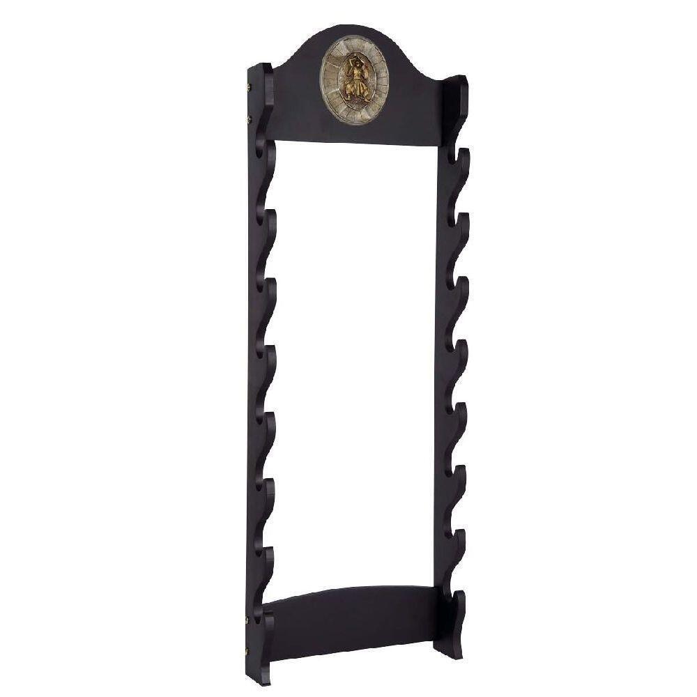 Vægholder til 8 samurai-sværd - Med emblem, lavet af bejdset træ.