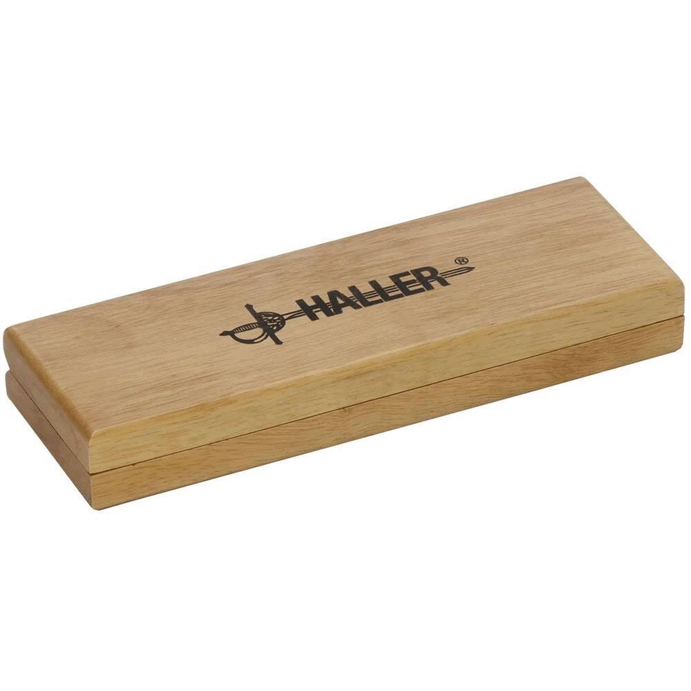 Haller Damaskus Foldekniv, Bøffelhorn Skæfte - Elegant lommekniv med klinge og bolsters i damaskusstål (71 lag). Håndtag af bøffelhorn, neglerille til nem åbning. Bladlængde: 70 mm, vægt: 90 g. Leveres i en eksklusiv trææske.
