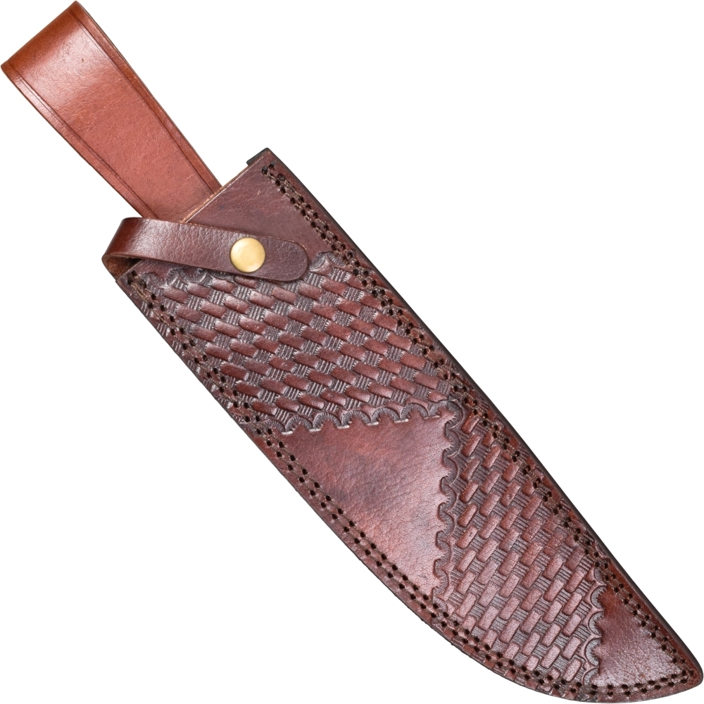 Håndtaget er kunstfærdigt lavet af træ og ben og suppleres med messingbeslag, hvilket giver et både elegant og sikkert greb. Det ergonomiske design gør det muligt at arbejde komfortabelt i længere perioder. Kniven leveres desuden med en læderskede, der beskytter klingen og gør det nemt at transportere den sikkert.