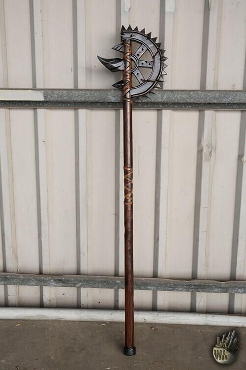 Gear Axe er 155 cm lang med et 115 cm greb skulpturelt og håndmalet til at ligne ægte træ. Det store øksehoved er designet til at ligne et tandhjulsblad med en 60 cm bid og 17 tænder. Den modsatte side har tre pigge, bare hvis gearbladet ikke er farligt nok for dig.