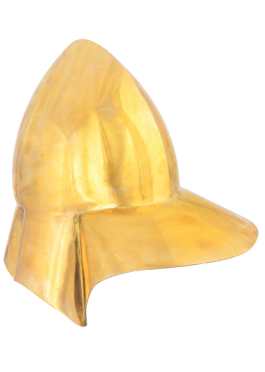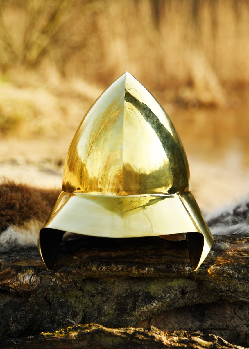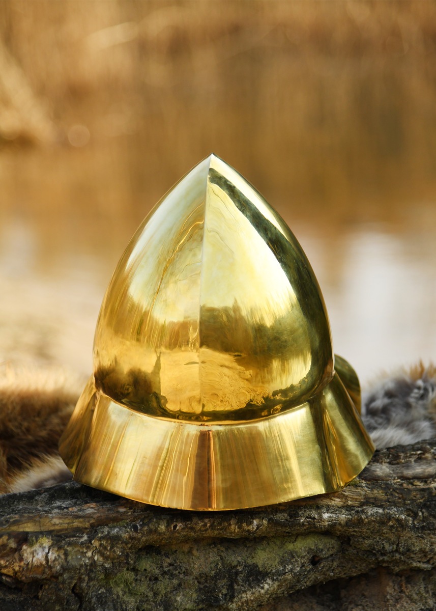 Denne replika fra Battle Merchant er fremstillet i ét stykke 1,2 mm messing, præcis som de historiske forbilleder, og har et elegant, autentisk udtryk. Hjelmen er ikke foret indvendigt, men leveres med en polstret bomuldshætte, som gør den fuldt anvendelig til reenactment, LARP, teater og historisk formidling.