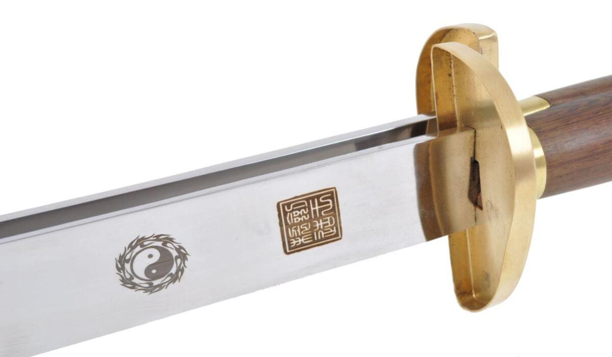 Traditionelt dobbelt bredsværd/Sabel lavet af Jian Wang smedje i Longquan. Blade i poleret rustfrit stål med en skinnende finish. Bagua- og smedelogoer er indgraveret tæt på guarden. Simple kobberdele, ikke indgraveret.