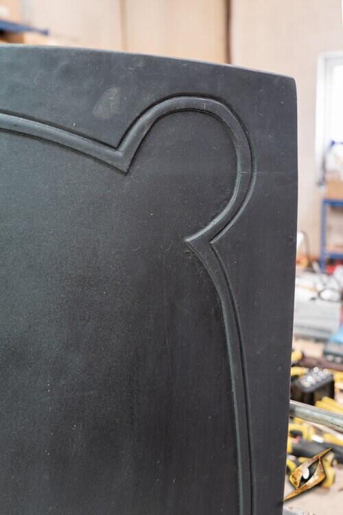 Buet øverste venstre hjørne kaldes en bouche, som historisk blev gjort for at tjene som hvile for en jousters lanse og for at forbedre ridderens syn.