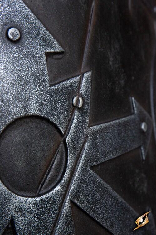 Lavet af slidstærkt skum med lukket celle og overtrukket med latex, dette skjold er mere end klar til LARP-kamp. Skulptureret og håndmalet med realistiske detaljer som ridser og indhak, dette skjold har en mørk mat metallisk finish og metallisk trim med nitter. Et kors vises i midten. Bevar dit greb om dette vilde skjold med tri-position greb og justerbare spænderemme, der findes på indersiden.