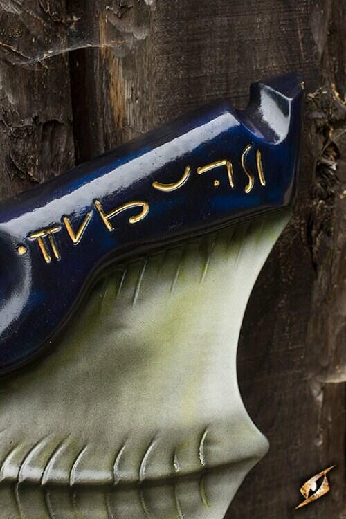 Wing Shield er et skjold designet som en del af Dark Elven Universe. Håndmalet og skulpturelt til at ligne en mørkeblå krybdyrvinge med gyldne runeskæringer, er dette 85 cm lange skjold stærkt detaljeret og perfekt til en ond eller mørk inspireret karakter.