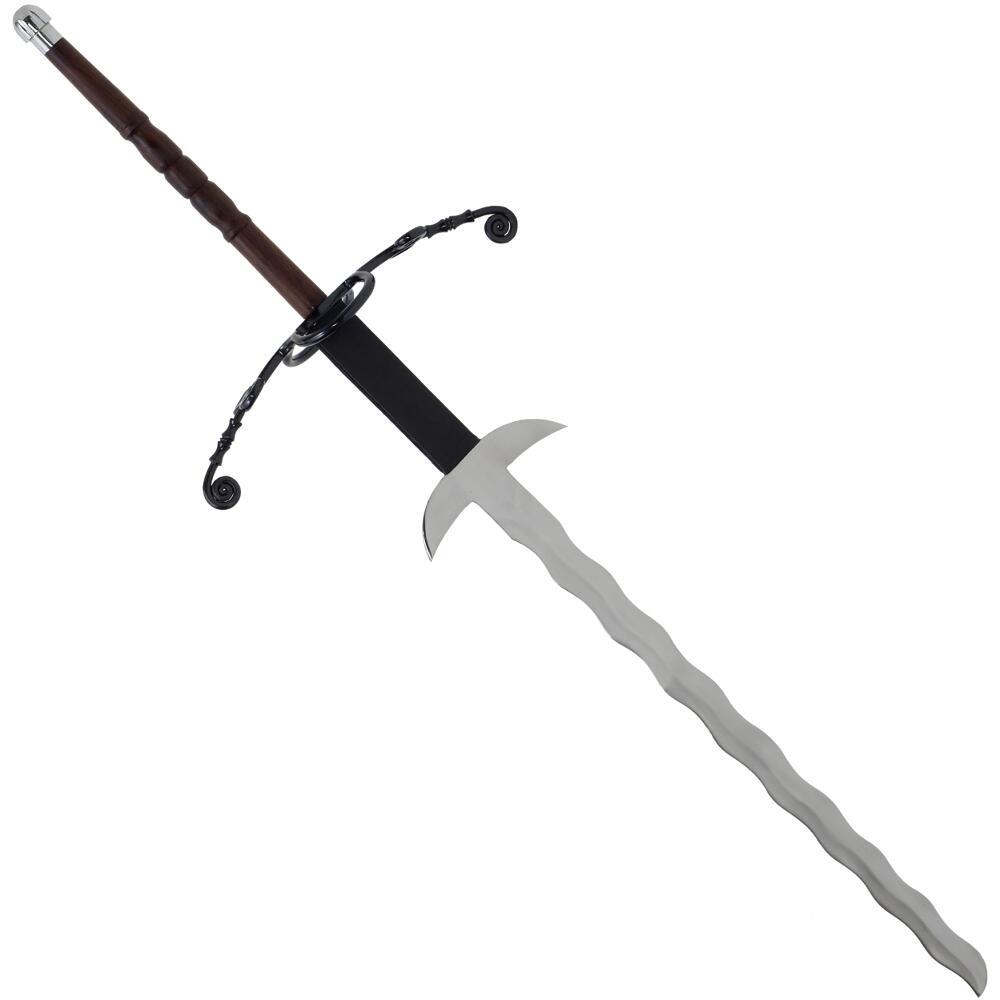 Flammberge – Flamme Sværd, Streetsweeper er et imponerende dekorativt langsværd i kulstofstål med flammeformet klinge og to-håndsgreb. Med sine 144 cm er det et spektakulært udstillingssværd, perfekt til samlere og middelalderinteresserede, der ønsker et dramatisk blikfang.