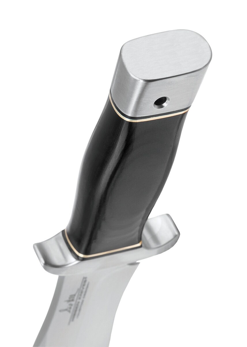 Håndtaget er fremstillet af sort linned Micarta, kendt for sin holdbarhed, komfort og skridsikre egenskaber. Den elegante kontrast mellem det mørke håndtag og de sølvfarvede ståldetaljer giver et sofistikeret og tidløst look. Den rustfrie stålpommel og håndbeskytter sikrer balance og kontrol, selv under krævende brug.