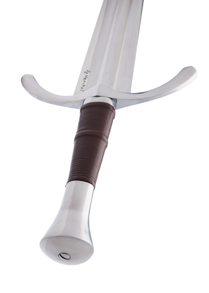Håndtaget er fremstillet i træ og omviklet med brunt læder, hvilket giver et komfortabelt og sikkert greb. Den tunge pommel i poleret stål bidrager til sværdets fremragende balance og gør håndteringen stabil og kontrolleret. Med en samlet længde på ca. 102 cm og en vægt på ca. 1,75 kg har sværdet en solid, autentisk fornemmelse uden at være uhåndterligt.