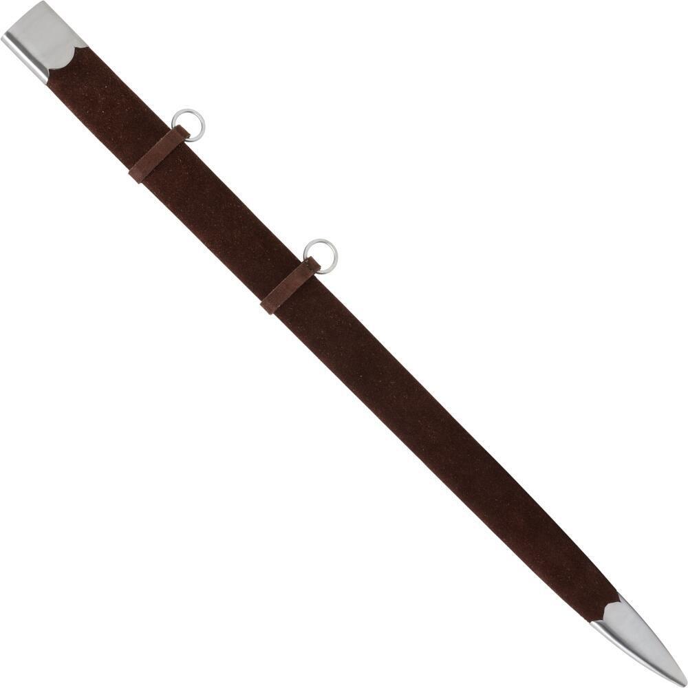 Skede: Skeden er dekoreret med stålfittings og er også beklædt med ruskind, hvilket matcher sværdets æstetik og giver en elegant opbevaringsløsning.