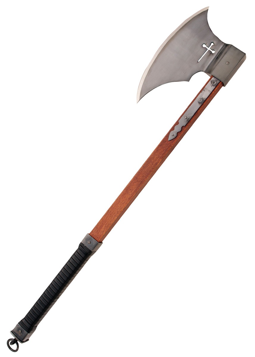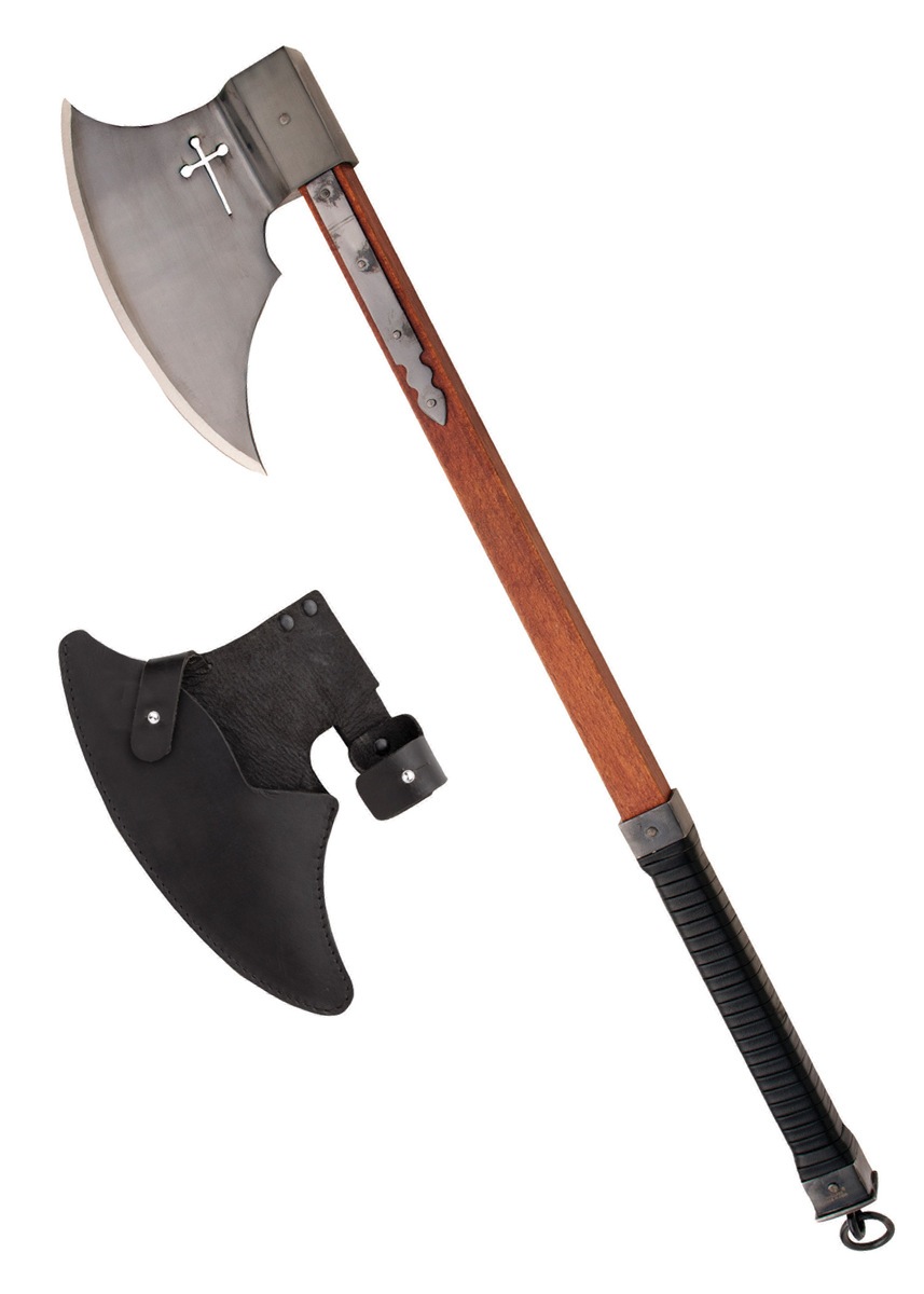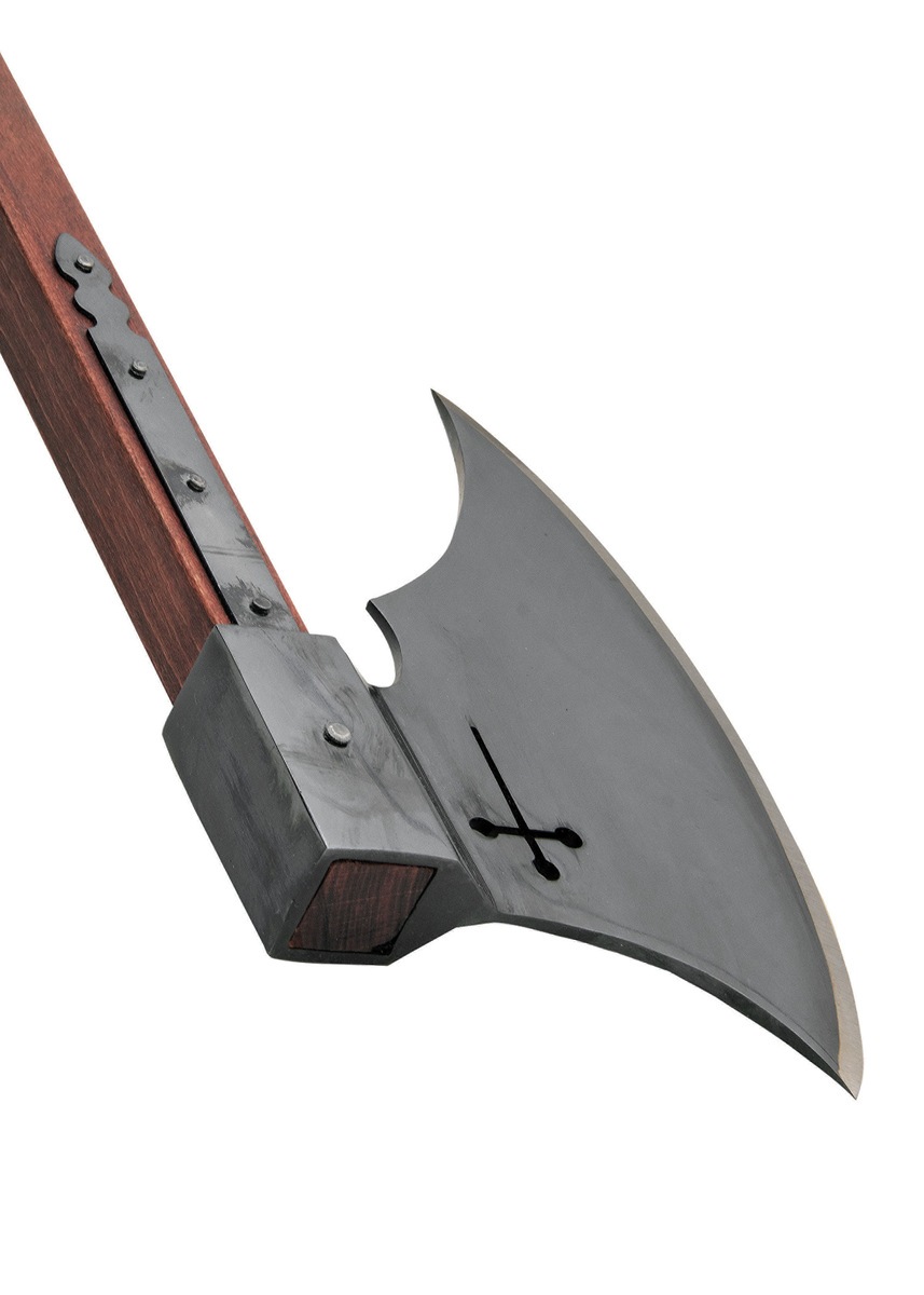Øksehovedet er fremstillet i high carbon steel og har en stor, kraftig klinge, som er slebet og gennembrudt af et markant kors – et stærkt symbol på korsriddernes tro og mission. Klingen er solidt nittet fast til skaftet og forstærket med langetter, der giver ekstra stabilitet og et troværdigt historisk udtryk. Alle metaldele er sortnerede, hvilket understreger øksens dystre og krigeriske æstetik.